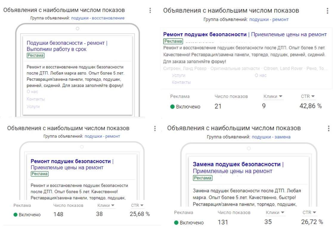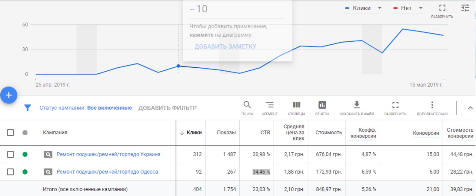 Реклама в поиске была запущена 29 апреля для Одессы. После недельного периода были получены такие результаты: