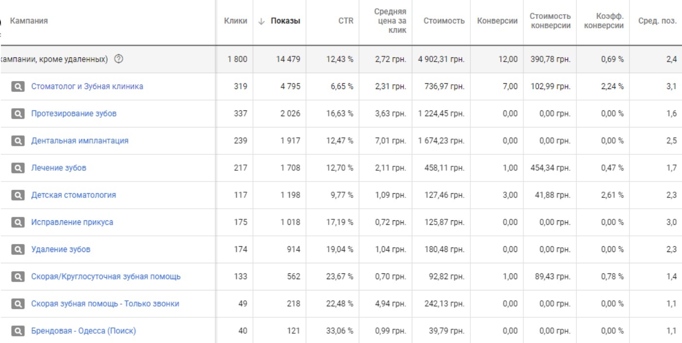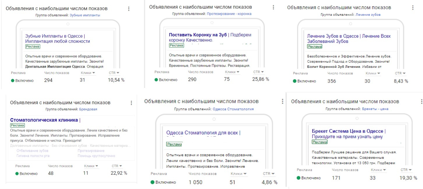 В ходе аудита выяснилось, что большинство слов содержат название города - Одесса. Известно, что чем длиннее "хвост" запроса, тем меньше охват. Если же ключевое слово состоит из 3 слов (например, "протезирование передних зубов"), то каждое последующее слово делает такой запрос "низкочастотным". Как правило, такие слова получают статус "мало показываются" и не приносят трафика.
